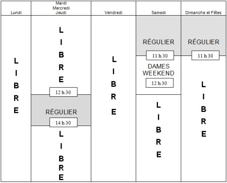 - Samedi, dimanche, Fêtes et vendredi après-midi : On peut réserver une heure de départ en personne ou en téléphonant au bureau jusqu’à une semaine à l’avance. Les feuilles des heures de départ pour les samedis, dimanches et après-midi de Fêtes sont disponibles à 11 h la semaine précédente. Les feuilles du matin sont disponibles à midi. La feuille du vendredi après-midi est disponible à 9 h le vendredi matin précédent.